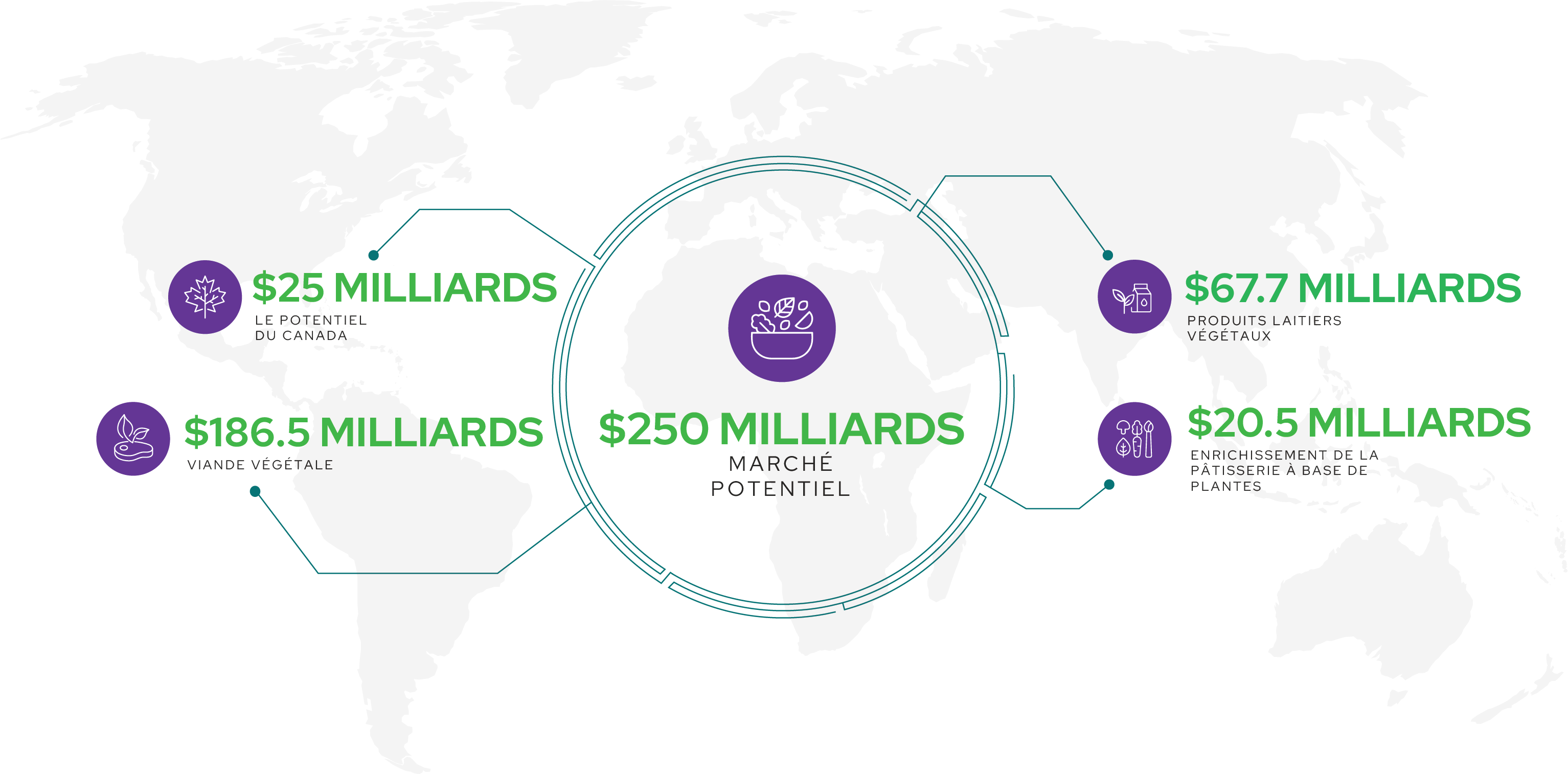 Le Canada est au beau milieu d’une opportunité de 25 milliards de dollars. La demande mondiale d'options protéinées saines et durables augmente, et avec elle le besoin d'investissements accrus et de solutions innovantes qui aident les entreprises canadiennes à base de plantes à répondre aux demandes en constante évolution des consommateurs.