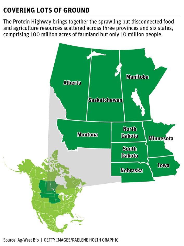 C'est une grande tâche, mais l'un des fondateurs de la Protein Highway pense qu'il est essentiel de rassembler les ressources alimentaires et agricoles tentaculaires mais déconnectées dispersées dans trois provinces et six États, comprenant environ 100 millions d'acres de terres agricoles mais seulement 10 millions de personnes.