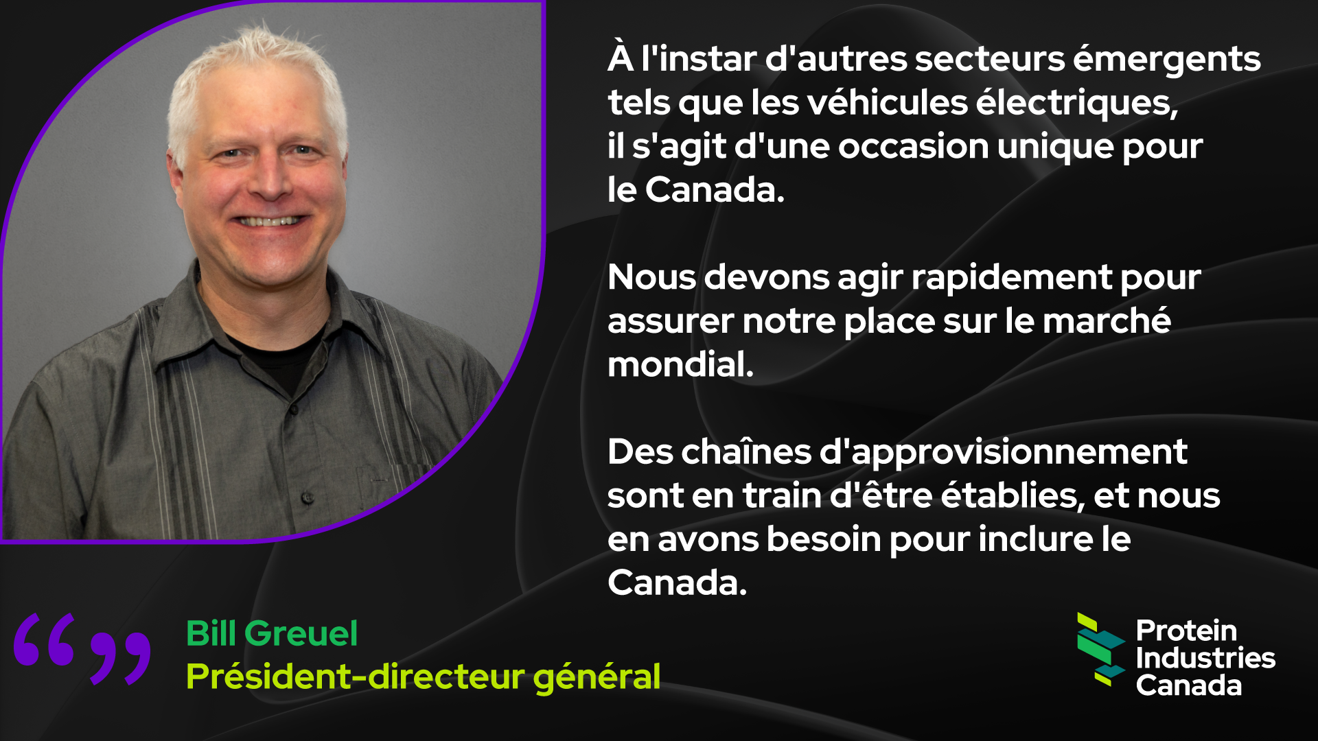 La récente recapitalisation de Protein Industries Canada, dans le cadre du programme Global Innovation Cluster, nous permettra de poursuivre notre important travail d'établissement de la chaîne de valeur des ingrédients du Canada, tout en positionnant le Canada comme partenaire de choix pour aider les pays à sécuriser leur chaîne d'approvisionnement alimentaire. Forts du succès des quatre dernières années, nous continuerons d'aider les PME canadiennes à faire progresser l'innovation dans les aliments d'origine végétale, à passer à l'échelle et à atteindre la commercialisation. Un élément clé de la construction de l'écosystème du Canada consiste à attirer et à entretenir de nouveaux investissements dans le domaine de la transformation des ingrédients.