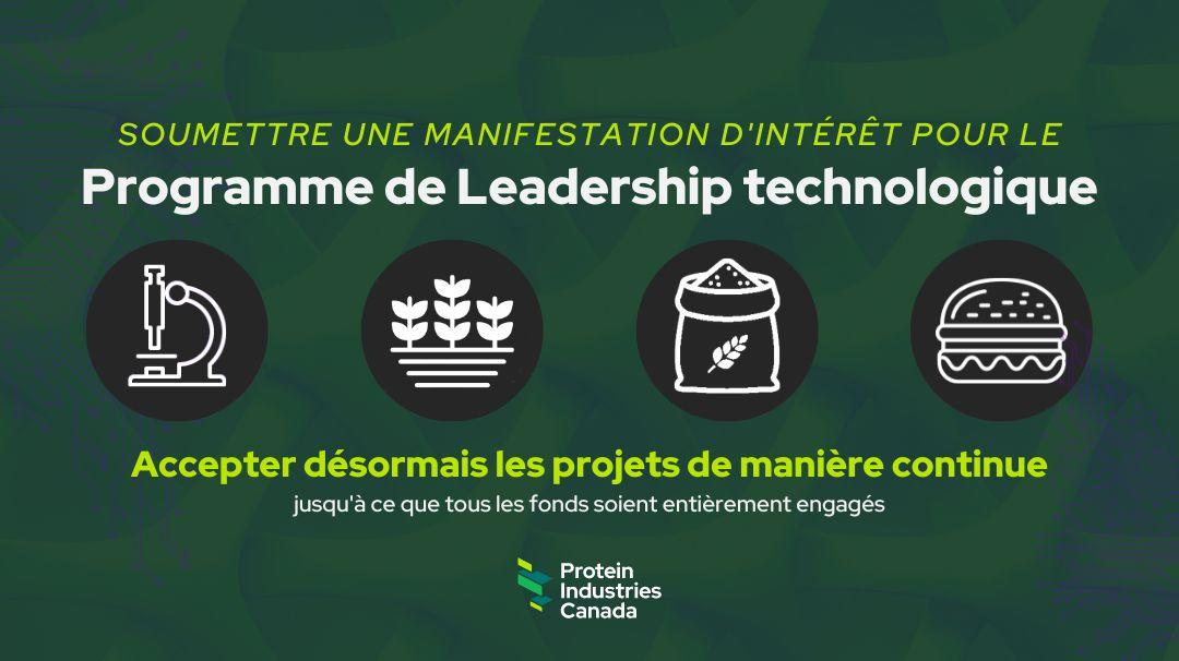 En plus d'ouvrir l'appel de projets de leadership technologique, Protein Industries Canada continue également d'accepter des projets dans le cadre du volet du Programme pancanadien d'intelligence artificielle (PCAIS). Les projets relevant de ce volet de programme devraient envisager l'application de l'intelligence artificielle pour soutenir les innovations dans des domaines tels que la génétique, l'amélioration de la production primaire, la durabilité, la formulation des ingrédients et des aliments, l'assurance et le contrôle de la qualité. Les projets seront acceptés jusqu’au 30 août 2024 ou jusqu’à ce que les fonds soient entièrement engagés. De plus amples renseignements peuvent être trouvés à proteinindustriescanada.ca/fr/intelligence-artificielle.