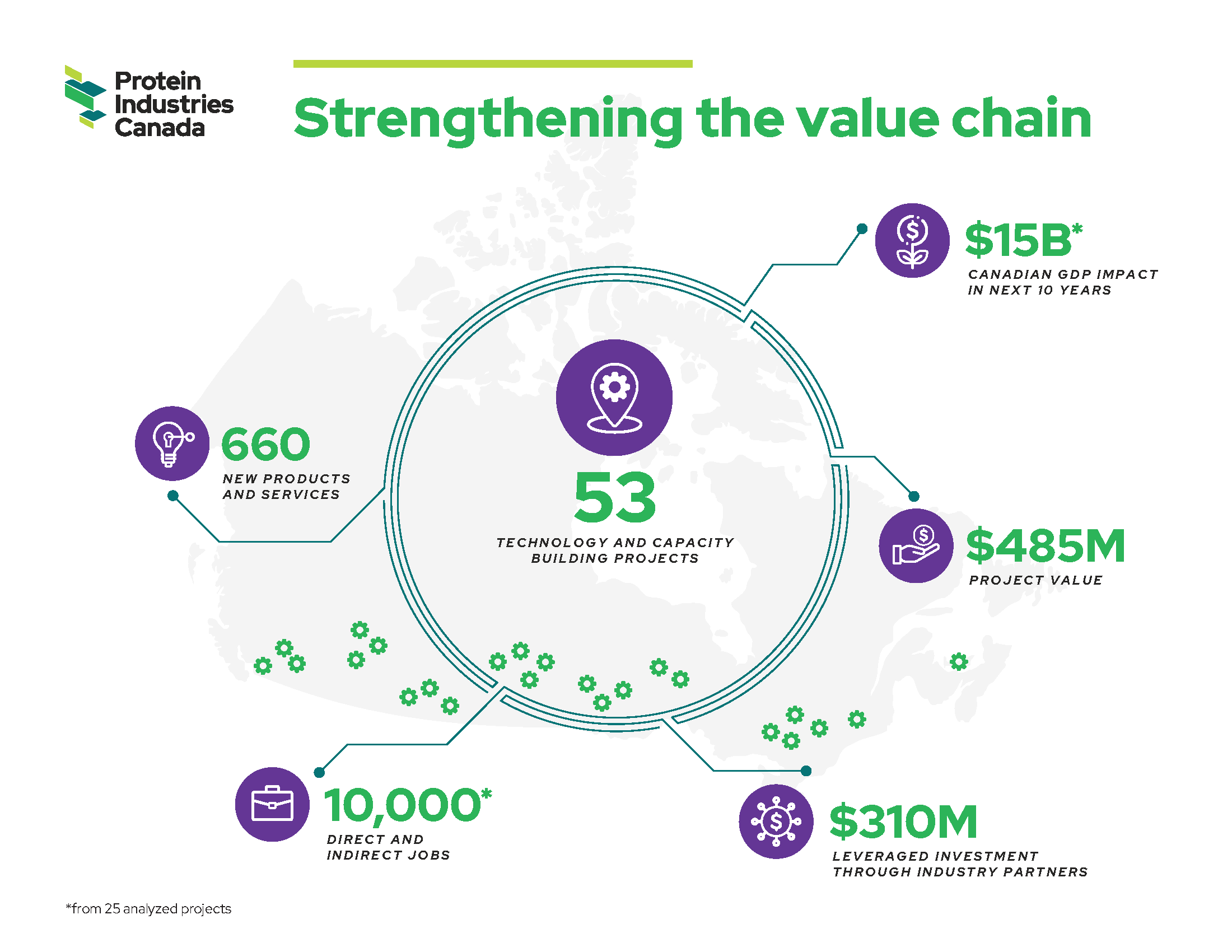 Le Canada a le potentiel – et est en bonne voie – d'être un chef de file mondial dans le domaine des ingrédients à base de plantes et des produits alimentaires finis. S'appuyant sur notre force en tant que puissance agricole ; avec plus de 28 millions d'hectares de terres arables et un important producteur de cultures riches en protéines telles que les pois et le canola, nous avons la possibilité de transformer cette demande mondiale en un moteur économique durable à long terme pour le Canada. En fait, chez Protein Industries Canada, nous croyons que d'ici 2035, le Canada fournira 10 % des ingrédients à base de plantes au monde - un objectif qui, une fois atteint, contribuera jusqu'à 25 milliards de dollars par année à l'économie canadienne. , soutenu par 17 000 emplois.